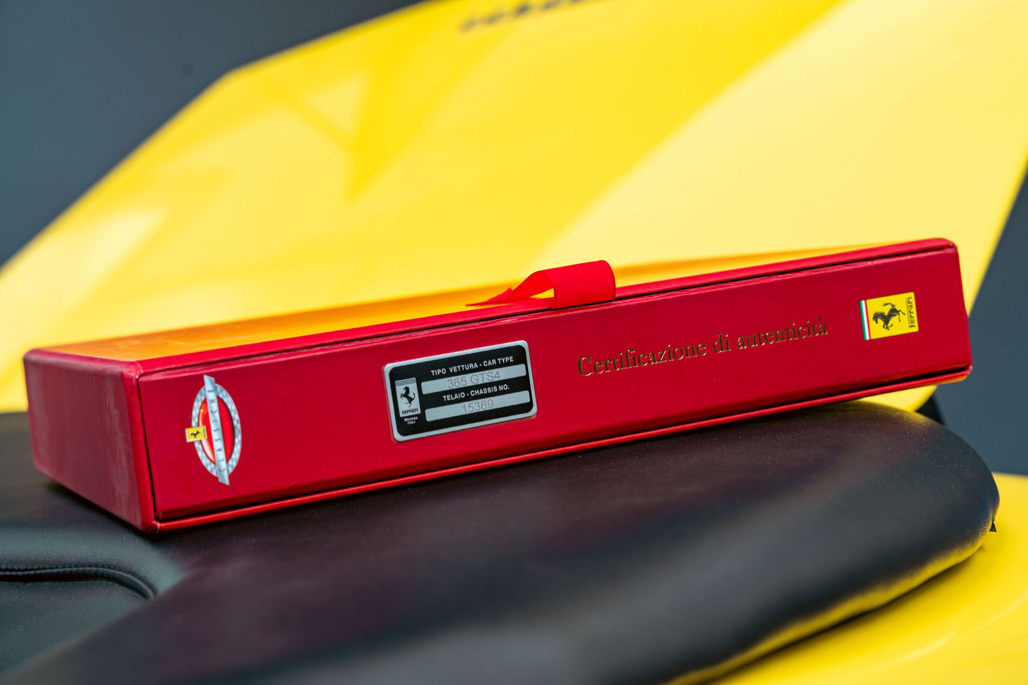 Chassis #15369 is 1 of 19 European cars, the only one delivered new in Giallo Fly (20-Y-191) – a color with a fascinating story. There are many legends surrounding the color: the more likely story, is that Fly was the name of a successful racehorse at the time – as is the case for many other Ferrari colors, and developed within Ferrari.